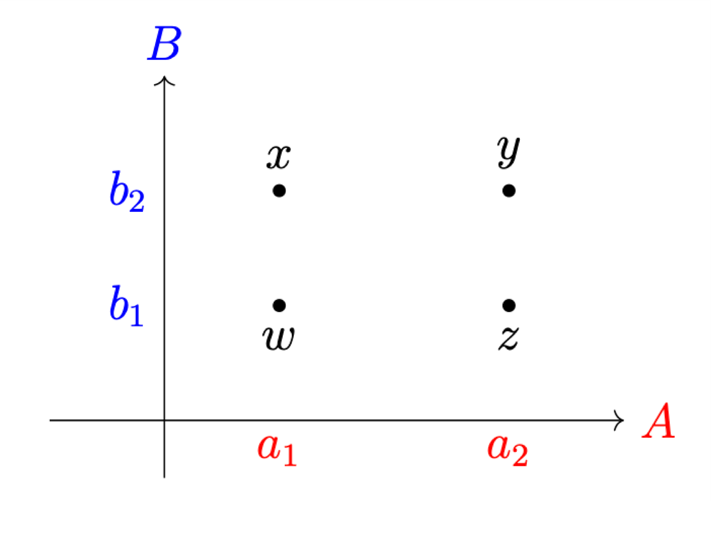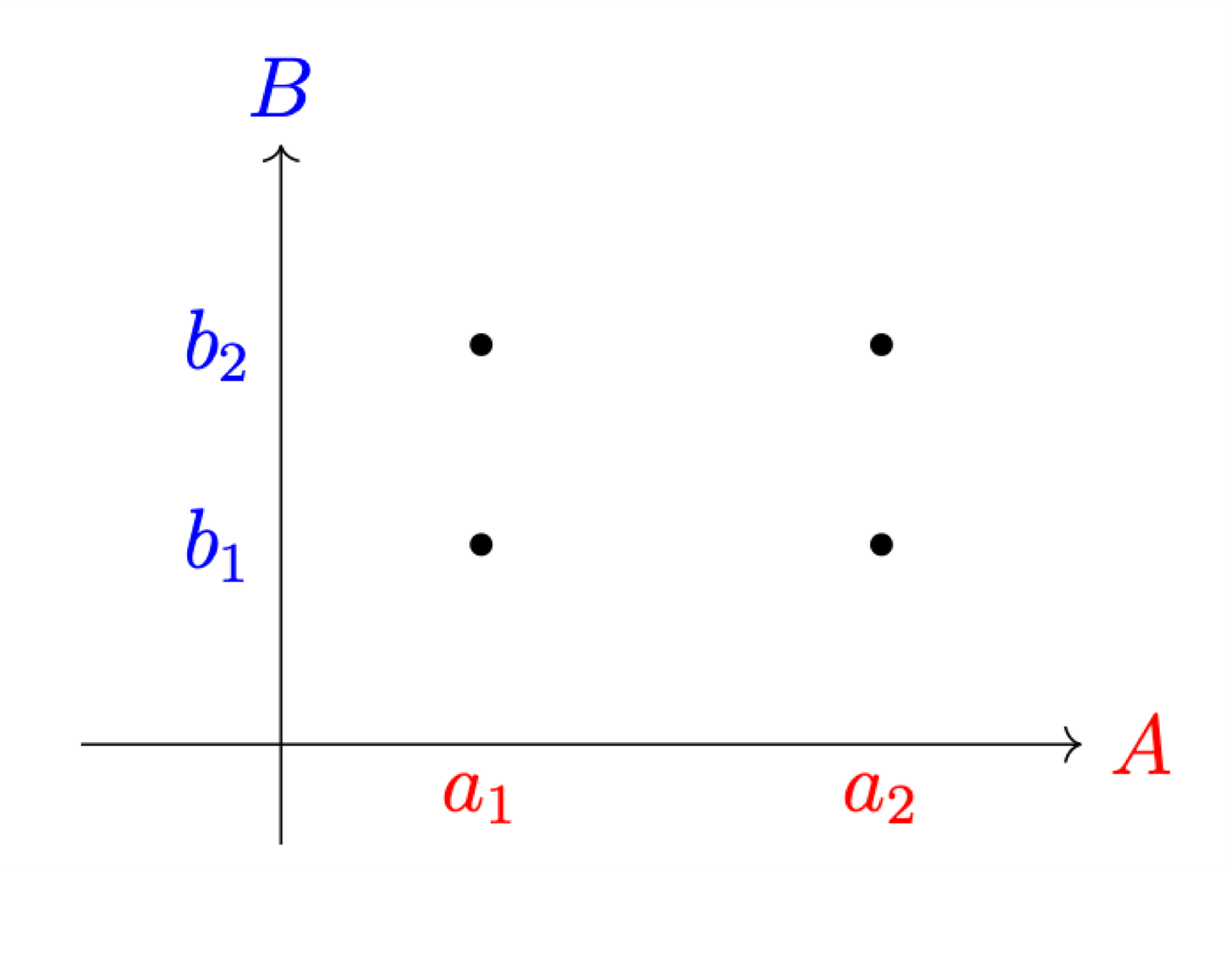 Universal properties are virtual governors, and indeed we observe that universal properties tell us when there is too much or too little of something in math. The Cartesian product is a really clear example of how this works. If A and B are each sets with two elements, then the task of the Cartesian product is to fill out the Cartesian plane in an optimal way.