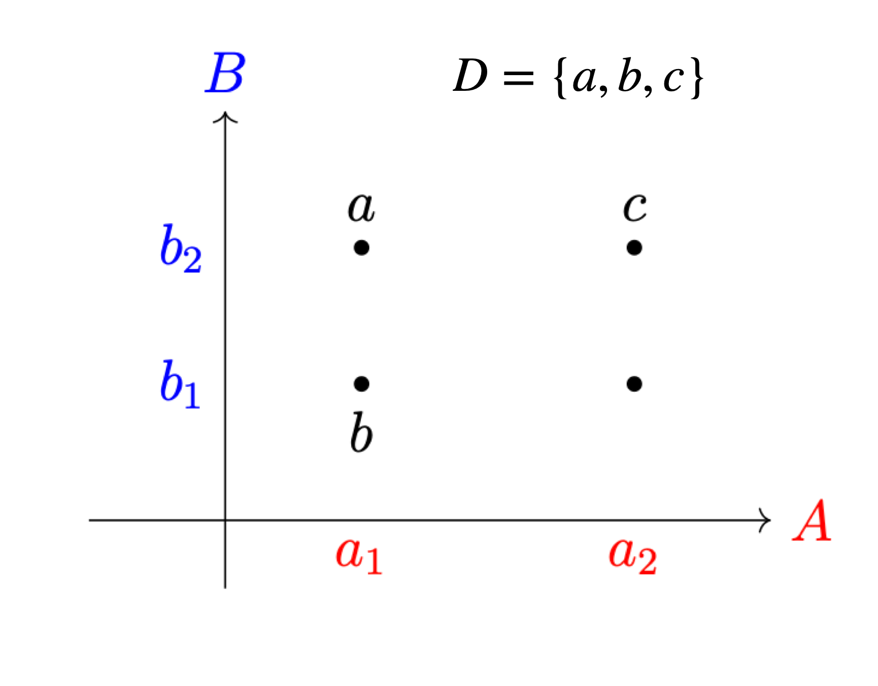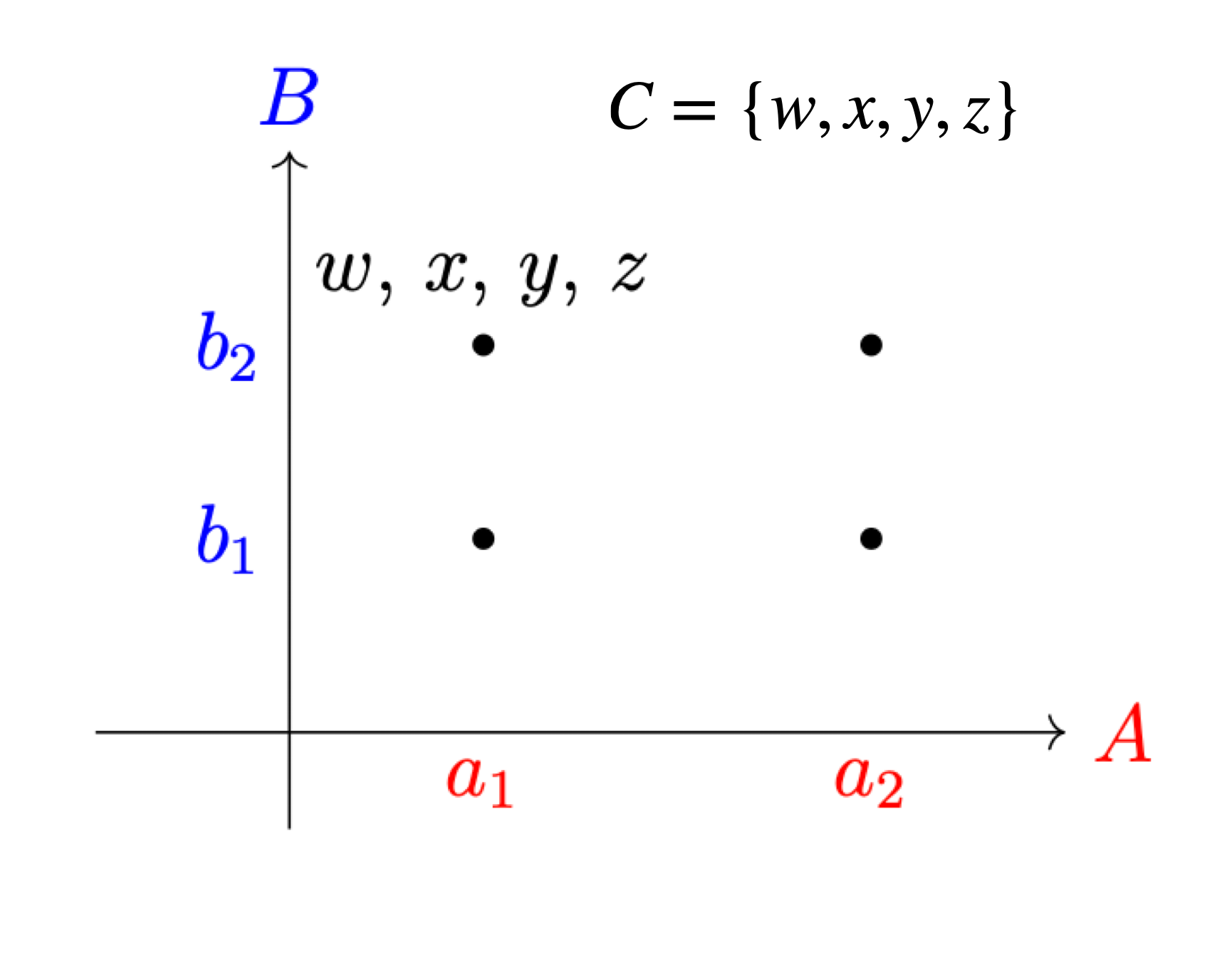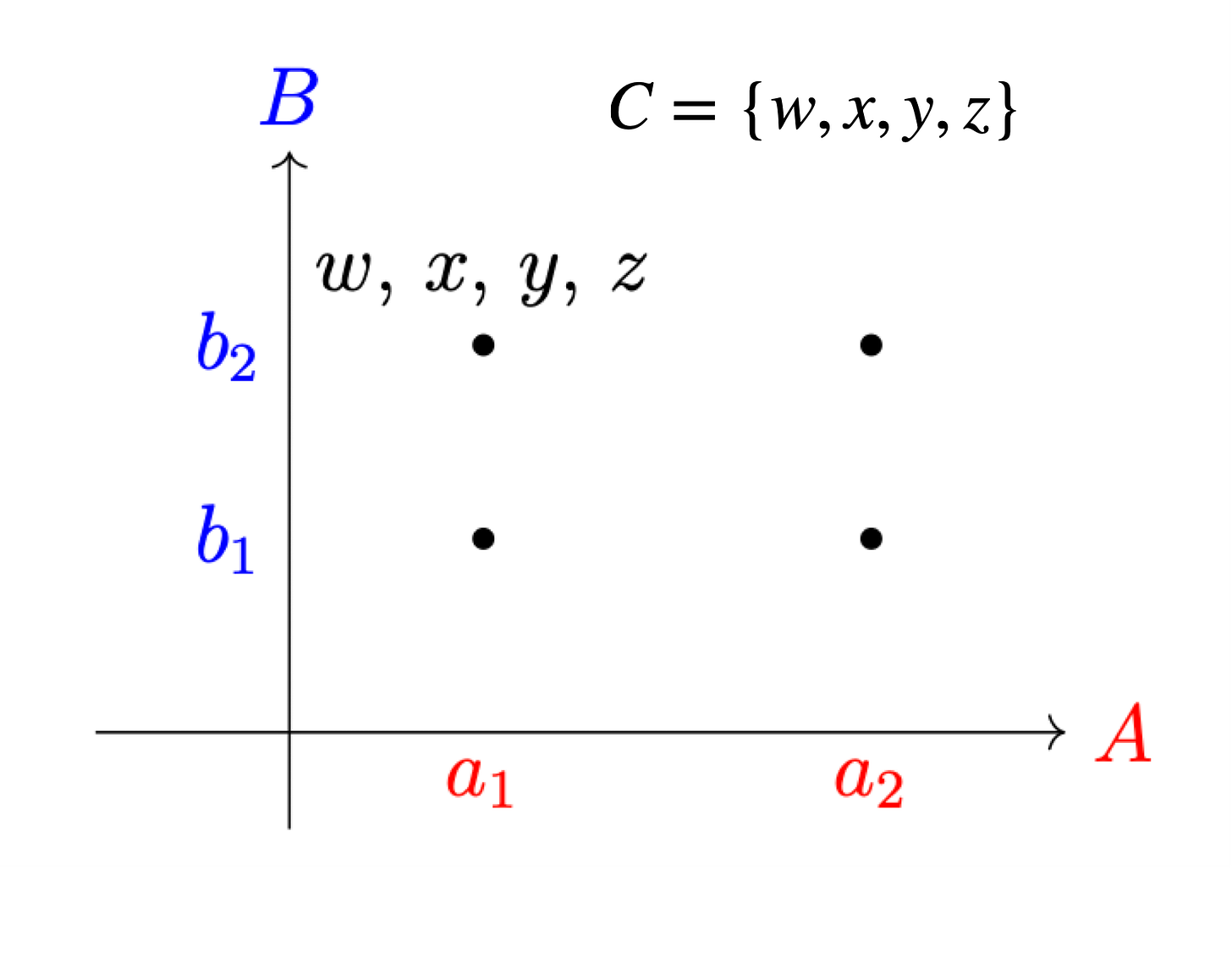 Obviously, there’s nothing wrong with a three-element set or a five-element set. In a vacuum, the three-element set is not missing anything, and the five-element set does not have anything extraneous. However, the optimization problem as defined by the universal property the product tell us whether something is missing or extraneous. Even a four-element set is not sufficient by itself. The “resources” the set brings to the problem have to be allocated correctly. Otherwise, once again, you have “too much” going to one place and “too little” going to another, from the perspective of the virtual governor that is the Cartesian product.