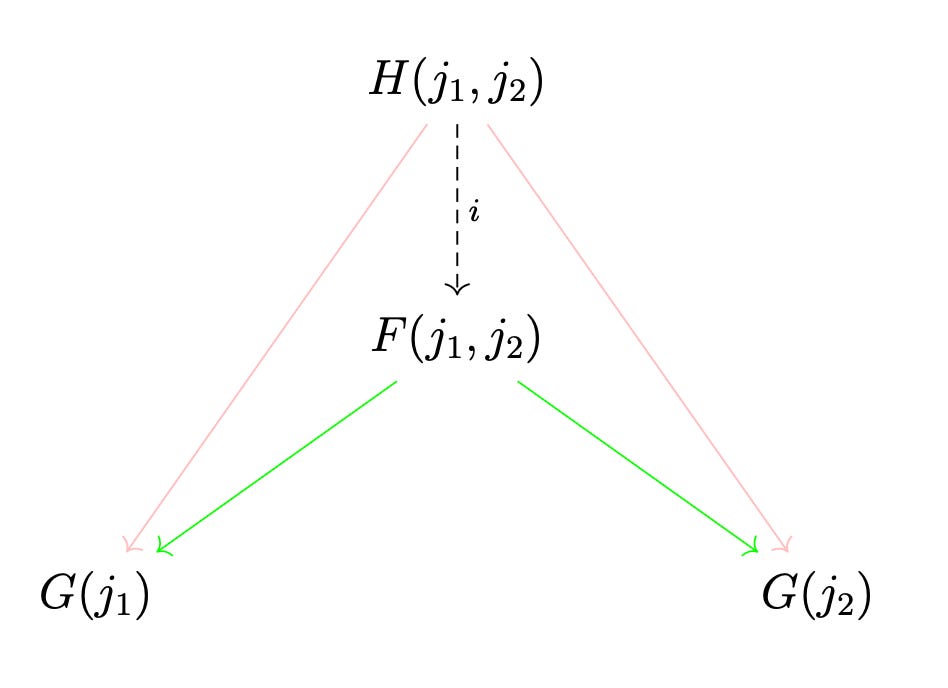 Then it’s just a matter of comparing our candidates in C. If there’s a unique morphism i from the latter candidate to the former such that this diagram commutes, then the former candidate is the optimal one. This means that if C were the category of sets, the optimal candidate would be the Cartesian product of the two objects it has arrows pointing to, and if C were the category of divisibility of natural numbers, then the optimal candidate would be the greatest common divisor of the two objects it has arrows pointing to.