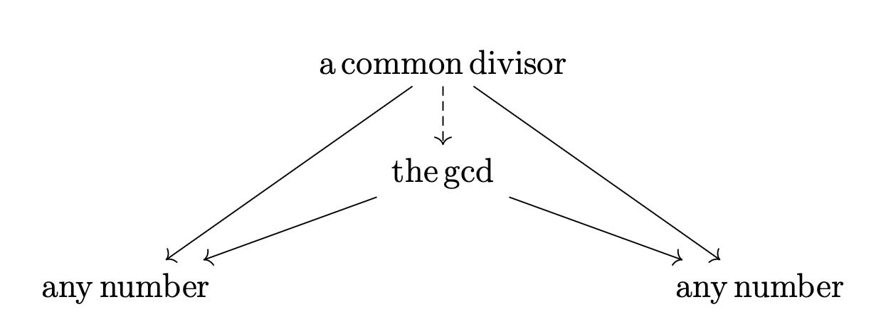 Every pair of numbers has a set of common divisors, numbers that divide both elements of the pair. For example, 2 → 8 and 2 → 12, so 2 is a common divisor of 8 and 12. But it’s not the only one. Another common divisor is 4 since 5 → 8 and 5 → 12. In fact, 4 is the greatest common divisor, or gcd, of 8 and 12: all of the other common divisors of 8 and 12, namely 1 and 2, are less than 4.