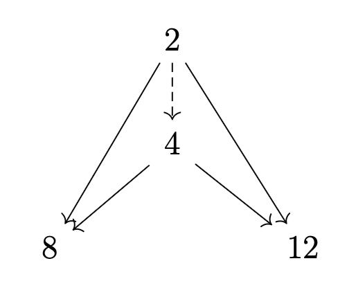 The arrows denote divisibility. The arrow from 2 to 4 is dashed to denote that it is unique (there’s only one way to divide 4 by 2), although in this category all the arrows are unique so it’s a bit redundant. More generally, we have this diagram: