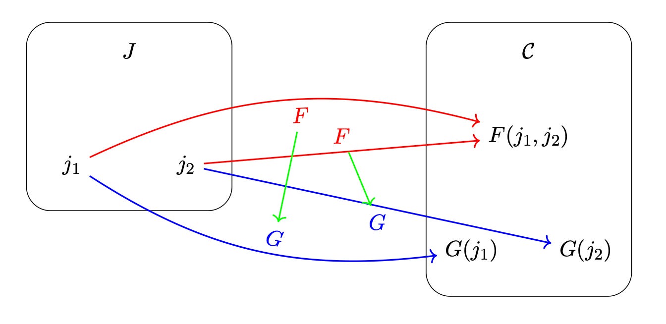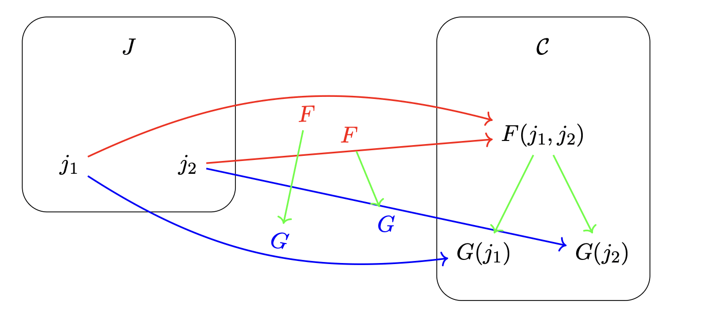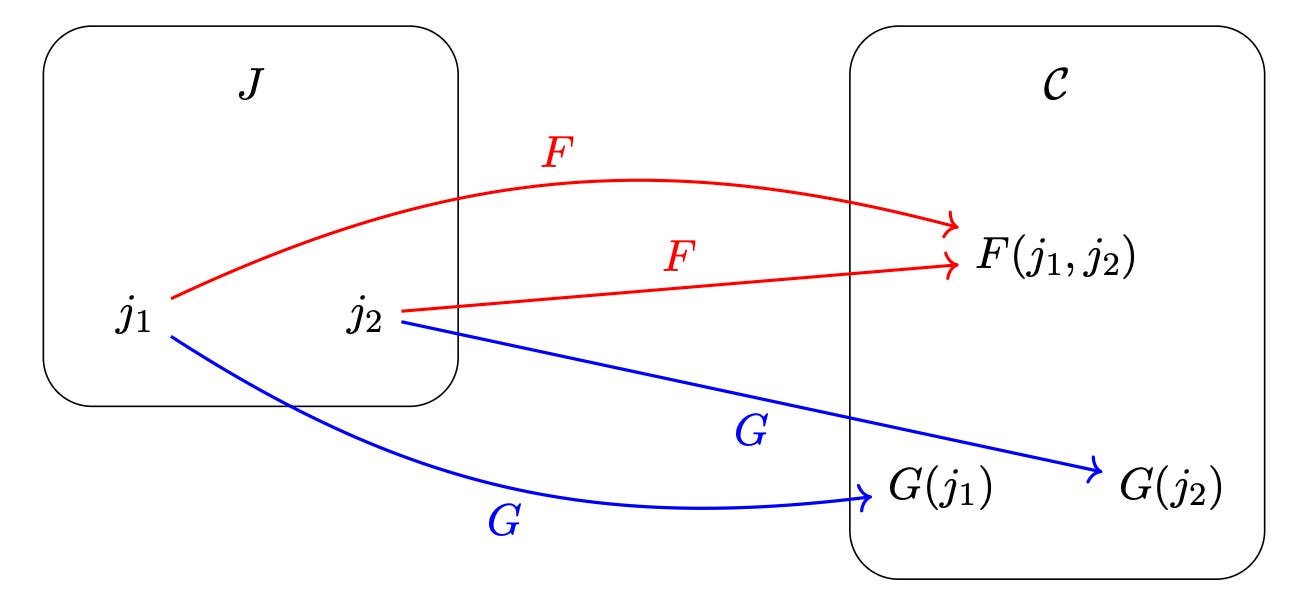 So what is the optimization problem? Every universal property is defined in terms of doing an optimal job of relating to some objects in the system as denoted by arrows, whether that’s the Cartesian product AxB relating to A and to B via the two arrows going out of it, or the greatest common divisor 4 relating to 8 and to 12 via the two arrows going out it. In this case, the underlying optimization problem being asked is, “Do you have an object that relates to two other objects in an optimal way?” So to pose the optimization problem, the indexing category for the underlying pattern we’ve been looking at is just a category with two objects. Then we just consider how that category J relates to other categories C via maps like F and G.