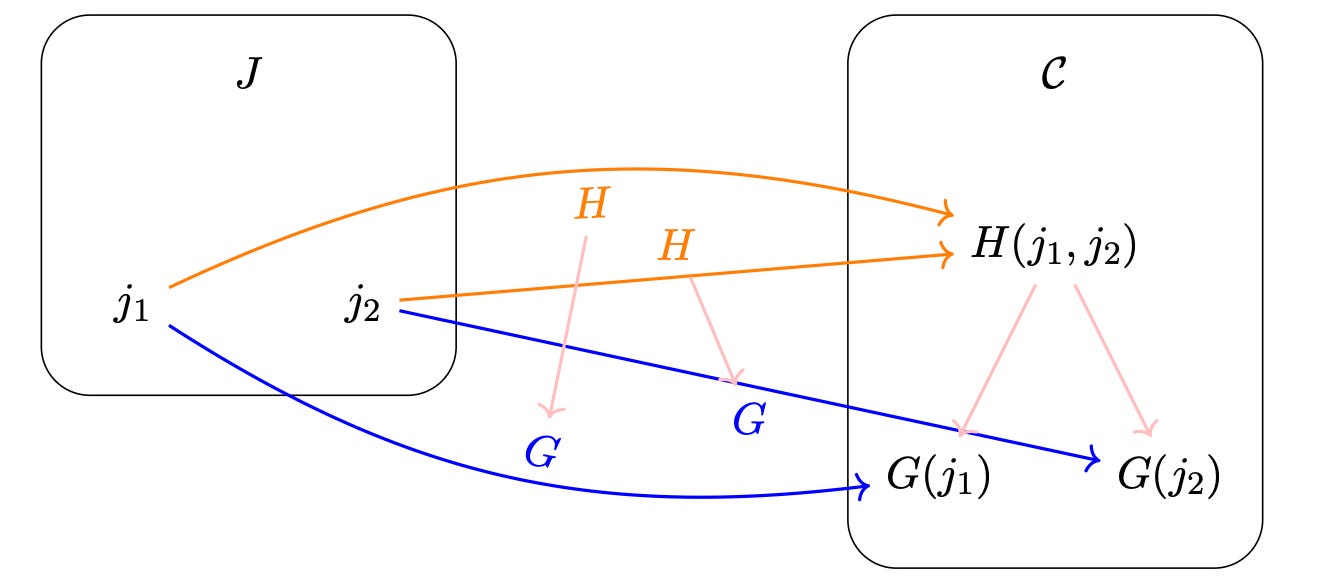 So by using those maps like F, G, and H, we can pull in the pattern from J into an arbitrary category C and see if there’s an optimal solution in C. The ingressing patterns from J do all the work of defining the optimization problem and constructing all of the candidates for the optimal solution. The only work that C does is comparing all the candidates to figure out which, if any, are optimal.